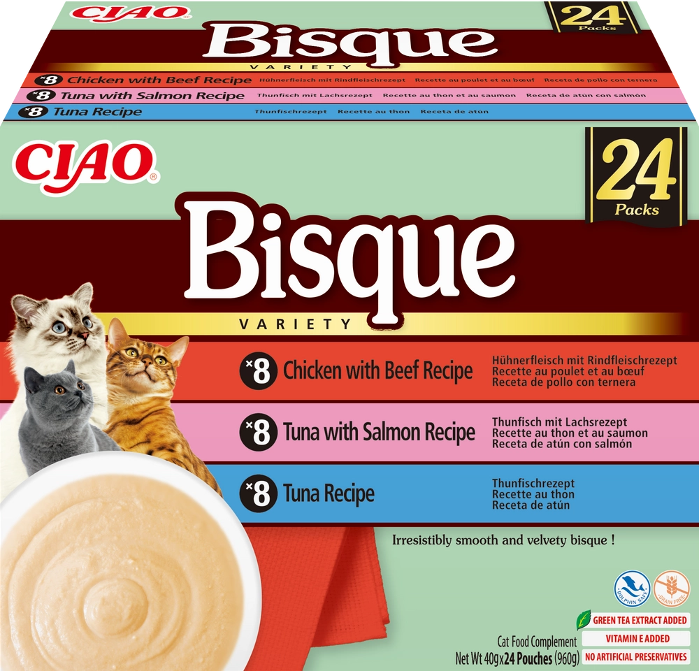 Skład: Formuła z kurczakiem i wołowiną: kurczak (28,2%), wołowina (1,8%), tapioka (suszona), ekstrakt z przegrzebka (0,9%). Formuła z tuńczykiem i łososiem: tuńczyk (28,2%), łosoś (1,8%), tapioka (suszona), ekstrakt z tuńczyka (0,9%). Formuła z tuńczykiem: tuńczyk (30,0%), tapioka (suszona), ekstrakt z tuńczyka (0,9%).