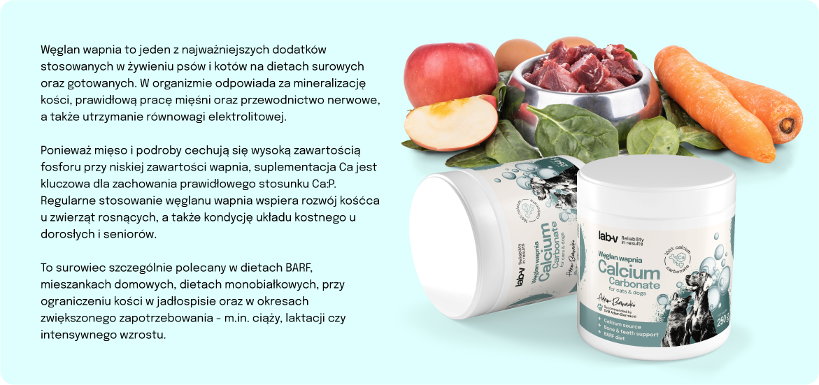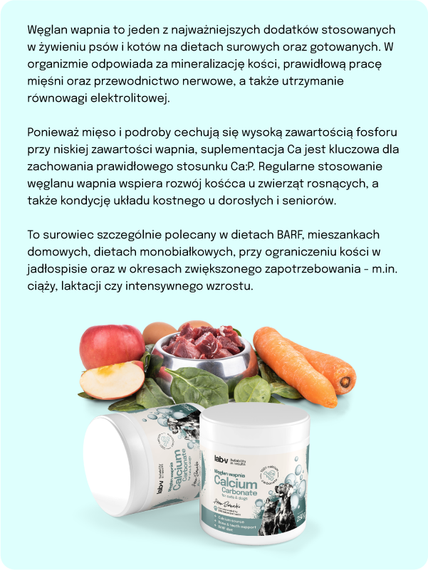 Węglan wapnia to czyste źródło łatwo przyswajalnego wapnia, przeznaczone do uzupełniania diety psów i kotów - szczególnie przy żywieniu BARF i karmach gotowanych.