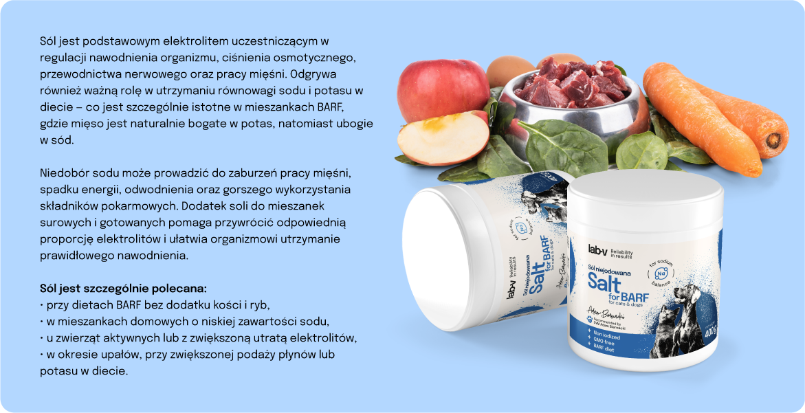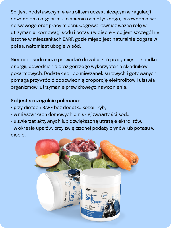Dieta BARF (psy/koty): 0,5–1,0 g soli / 1 kg mieszanki mięsnej.