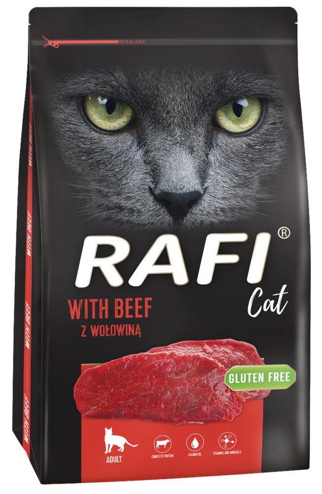 Właśnie dlatego sucha karma dla kota Rafi Cat zawiera mięso wołowe najwyższej jakości.. Produkt jest bogaty w łatwostrawne białko i tłuszcze ułatwiające wchłanianie wysokokalorycznych elementów posiłku do organizmu. Ten pełnoporcjowy pokarm pokrywa w całości zapotrzebowanie czworonoga na wszystkie składniki odżywcze. Dodany do receptury olej z łososia jest źródłem kwasów n-3 i n-6, a drożdże dostarczają witamin, minerałów i składników o charakterze probiotycznym. Zawarte w karmie witaminy A,E i D3 utrzymują dobrą kondycję skóry i sierści, wspomagają odporność i pozytywnie wpływają na stan zębów i kości. Cynk i mangan również mają korzystny wpływ na skórę i sierść, zaś żelazo zmniejsza ryzyko wystąpienia anemii, natomiast jod wykazuje działanie regulujące przemiany materii. Karma Rafi Cat jest nie tylko bogata w wartościowe składniki, to przede wszystkim pyszny posiłek, w którym rozsmakuje się niejeden kot.