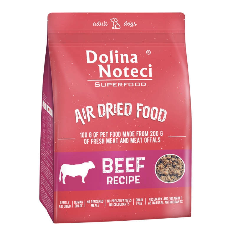 Dolina Noteci SUPERFOOD danie z wołowiny to pełnowartościowa karma suszona, zaspokaja w pełni potrzeby żywieniowe dorosłych psów wszystkich ras. Której skład surowcowy uwzględnia składniki odżywcze i związki biologicznie czynne. 100 g gotowego produktu powstaje z aż 200 g świeżego mięsa i produktów pochodzenia zwierzęcego z wołowiny, kurczaka i wieprzowiny. Proces delikatnego suszenia pozwala zachować jak najwięcej składników odżywczych pochodzących z surowców użytych do produkcji karmy. Mięso i produkty pochodzenia zwierzęcego z wołowiny dostarczają cennego białka bogatego w aminokwasy oraz stanowią źródło potrzebnych dla zdrowia pierwiastków - selenu, żelaza i miedzi. Wołowina jest także źródłem ważnej dla organizmu psa witaminy B12 oraz witamin rozpuszczalnych w tłuszczach. Dodatek jaja kurzego i tłuszczu z kurczaka wzbogaca karmę suszoną serii Dolina Noteci SUPERFOOD w niezbędne nienasycone kwasy tłuszczowe z rodziny n-6. Zawarte w marchwi, szpinaku, borówkach, malinach, pomarańczy i groszku związki biologicznie czynne charakteryzują się właściwościami przeciwutleniającymi i przeciwzapalnymi. W istotny sposób wpływają one na hamowanie zmian związanych ze starzeniem się, rozwojem miażdżycy i uszkodzeniami wątroby. Funkcje przewodu pokarmowego, zarówno trawienne, jak i wydzielnicze, są wspomagane dzięki uzupełnieniu karmy nasionami szałwii hiszpańskiej (chia), siemieniem lnianym, jukką Mojave oraz wodorostami morskimi. Dodatek drożdży piwnych i inuliny z cykorii poprawia kondycję sierści oraz podtrzymuje prawidłowy skład flory jelitowej. Cennym dodatkiem w karmie suszonej serii Dolina Noteci SUPERFOOD są składniki pochodzące z omułka nowozelandzkiego, które odpowiadają za utrzymanie właściwego stanu chrząstki stawowej oraz działają przeciwzapalnie na tkankę kostną. Przestrzeganie zalecanej ilości podawanej psu karmy nie powoduje ryzyka powstania nadwagi czy otyłości. Dobrym uzupełnieniem diety opartej na karmie suszonej jest podawanie psu świeżej wody do picia, która w sposób naturalny wspomaga przyswajanie składników w niej zawartych.
