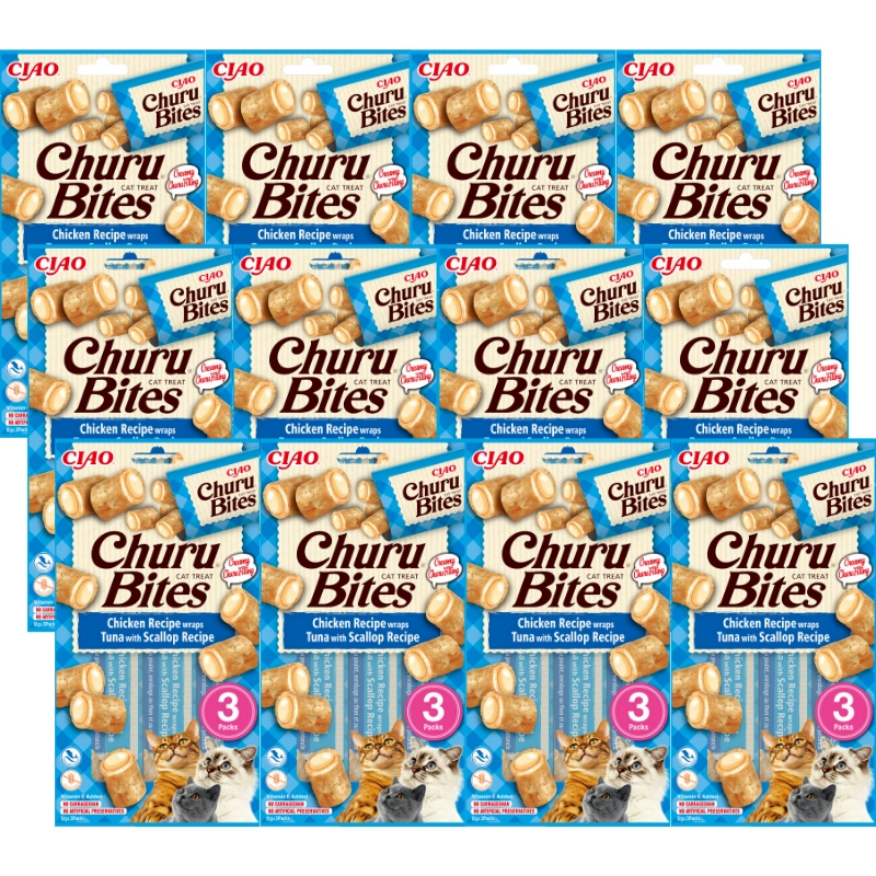 Kawałki Churu Bites to przysmaki w kształcie kąsków przypominających poduszki, złożonych z dwóch różnych tekstur: zewnętrznej z pieczonego kurczaka i wewnętrznej, stanowiącej kremowe nadzienie o różnych smakach. Produkt można stosować jako nagrodę lub przekąskę. Jest także przydatny podczas podawania leków lub suplementów w formie tabletek, ponieważ można je ukryć w miękkim środku kąska.