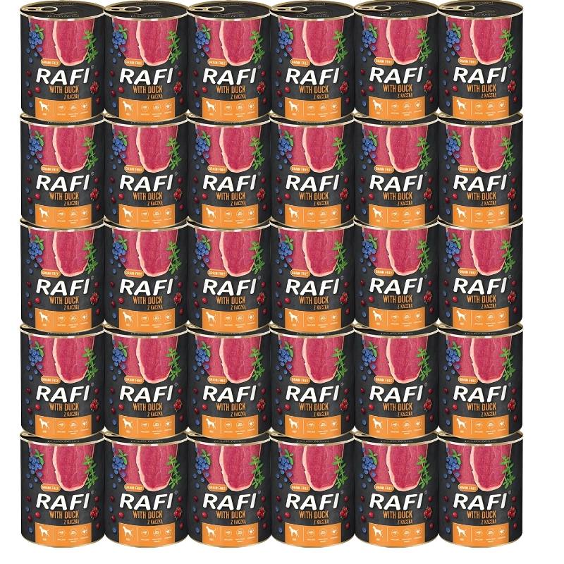 Ta mokra karma Rafi, dzięki wykorzystaniu mięsa i surowców pochodzenia zwierzęcego z kaczki, jest źródłem pełnowartościowego białka zawierającego wszystkie aminokwasy egzogenne. Dodatkowo wysoka zawartość aminokwasów deficytowych (szczególnie siarkowych) zmniejsza konieczność ich uzupełniania poprzez produkty zbożowe. Karma z kaczką zawiera selen, miedź i żelazo w odpowiednich proporcjach, pokrywając w ten sposób dzienne zapotrzebowanie dorosłego psa. Szczególnie ważnymi składnikami obecnymi w mięsie i surowcach pochodzących z kaczki są kwasy tłuszczowe z rodzin n-6 i n-3, które regulują pracę układu trawiennego. Dodatek tymianku wpływa na zwiększenie walorów zapachowych i smakowych karmy oraz wspiera funkcje trawienne. Borówka chroni organizm przed działaniem wolnych rodników, a żurawina zapobiega infekcjom układu moczowego.