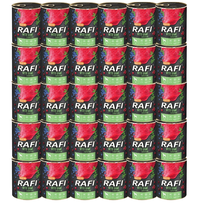 Mokra karma Rafi z dziczyzną charakteryzuje się wysoką zawartością pełnowartościowego białka oraz nienasyconych kwasów tłuszczowych, głównie n-3 odpowiedzialnych za wspieranie odporności. Mięso i surowce pochodzące z dziczyzny uzupełniają recepturę o aminokwasy - metioninę, izoleucynę i cystynę. Karma zawiera selen i miedź w ilościach pokrywających zapotrzebowanie dorosłego psa. Dodatek owoców: borówki amerykańskiej i żurawiny, dzięki występującym w nich związkach biologicznie czynnych, głównie procyjanidyn i flawonoidów, wykazuje silne właściwości przeciwutleniające i przeciwzapalne. Z kolei tymianek sprawia, że karma jest bardziej smakowita.