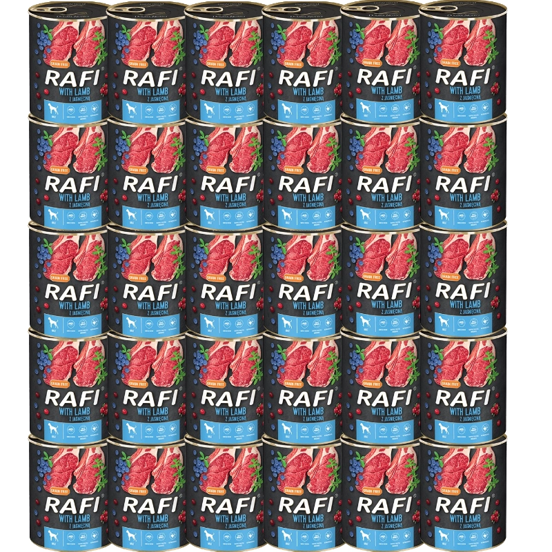 Mięso z jagnięciny to źródło pełnowartościowego białka, witamin z grupy B oraz wielu cennych mikro- i makroelementów warunkujących prawidłowe funkcjonowanie organizmu dorosłego psa. Kwasy tłuszczowe z rodziny n-3 i n-6 wspierają naturalną odporność, a także uczestniczą w regulowaniu procesów metabolicznych. Pełnią też funkcję nawilżającą – korzystanie wpływają na stan skóry i sierści. Mokra karma Rafi zawiera odpowiednie proporcje selenu i miedzi. Dodatek tymianku wpływa na atrakcyjność sensoryczną tej mokrej karmy. Mięso i surowce pochodzące z jagnięciny są również źródłem aminokwasów – metioniny, izoleucyny i cystyny. Walory karmy podnoszą obecne w składzie borówka oraz żurawina, źródła wielu cennych witamin i składników odżywczych.