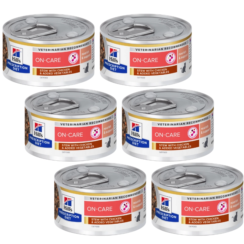 Hill's Prescription Diet ON-Care Stew z kurczakiem i dodatkiem warzyw to kliniczna karma, która zapewnia wsparcie żywieniowe, którego potrzebuje Twój kot. Skonsultuj się z lekarzem weterynarii, aby uzyskać więcej informacji na temat tego, w jaki sposób nasze karmy Prescription Diet mogą poprawić jakość życia Twojego kota.