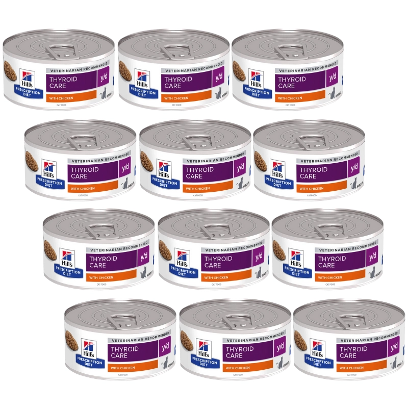 Mokra karma dla kotów Hill's Prescription Diet y/d to łatwy i wygodny sposób na zmniejszenie zawartości jodu w żywności przeznaczonej dla kotów z nadczynnością tarczycy. Karmienie tym produktem przez długi okres ma kluczowe znaczenie dla skuteczności uzyskania korzyści oferowanych przez produkt. Suche i mokre karmy w puszkach można mieszać lub podawać jednocześnie.