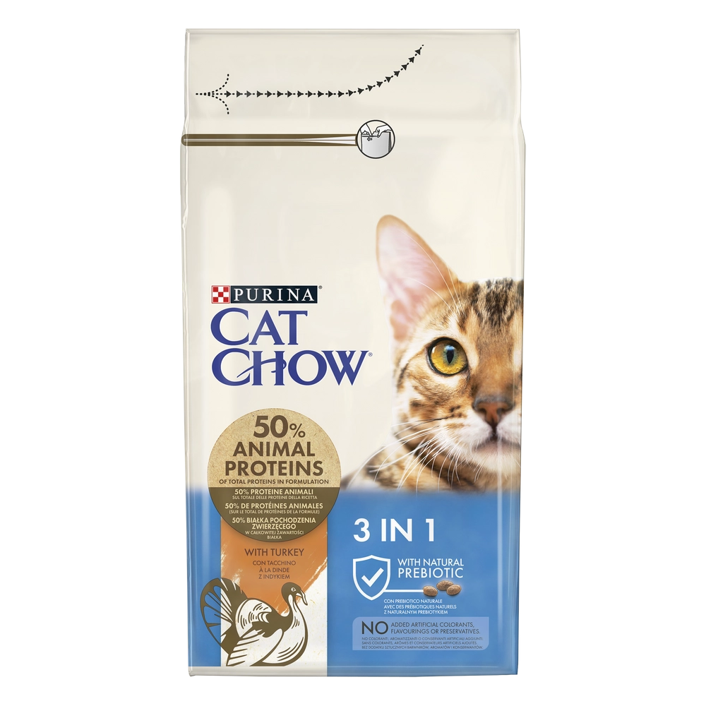 Pełnoporcjowa karma sucha Purina® Cat Chow® 3 in 1 z Indykiem to doskonałe rozwiązanie, które zaspokoi potrzeby Twojego dorosłego kota 🐱: