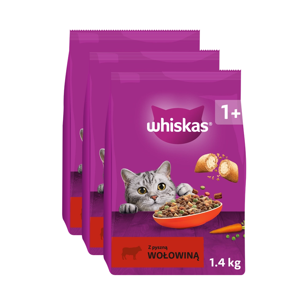Whiskas z pyszną wołowiną to pełnoporcjowy suchy pokarm z pasztecikami kruchymi na zewnątrz i z delikatnym nadzieniem w środku, które koty uwielbiają. Granulki z wysokiej jakości białkiem są starannie opracowane, aby dać Twojemu kociemu przyjacielowi wszystko, czego potrzebuje do mruczenia. Kompletna i zbilansowana receptura ze zdrowymi i apetycznymi warzywami - marchewką i groszkiem - zapewnia Twojemu kotu perfekcyjną dawkę wszystkich niezbędnych składników odżywczych - w tym witamin i minerałów. Dzięki karmie Whiskas, która jest przygotowana z wysokiej jakości składnikami pochodzącymi wyłącznie od zaufanych dostawców, Twój kot jest szczęśliwy, zdrowy i chętnie przybiega do miski za każdym razem w porze karmienia.