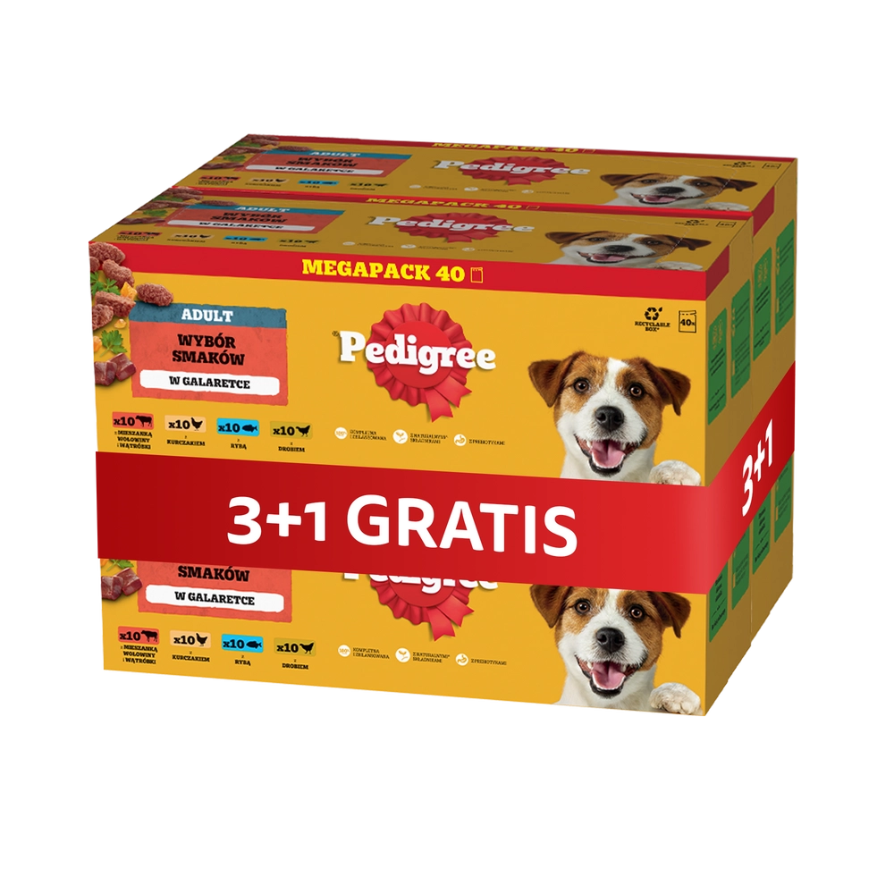 Mokra karma PEDIGREE® Adult Wybór Smaków w aromatycznej galaretce to pełnoporcjowe pożywienie przeznaczone dla dorosłych psów. Twój pies rozsmakuje się w czterech wyśmienitych smakach: z mieszanką wołowiny i wątróbki, z kurczakiem, z rybą, z drobiem. Receptura została opracowana przez lekarzy weterynarii i specjalistów ds. dietetyki z Instytutu Nauki o Zwierzętach WALTHAM™. Zawiera w składzie witaminę E i przeciwutleniacze, które posiadają właściwości antyoksydacyjne i wspomaga naturalne mechanizmy obronne Twojego psa oraz cynk, który wspiera zdrową skórę i sierść, aby pomóc Twojemu psu wyglądać i czuć się świetnie. Karma PEDIGREE® zawiera naturalne włókno pokarmowe i prebiotyki, które pomagają utrzymać zdrowe jelita bo każdy pies zasługuje na zdrowy brzuszek.