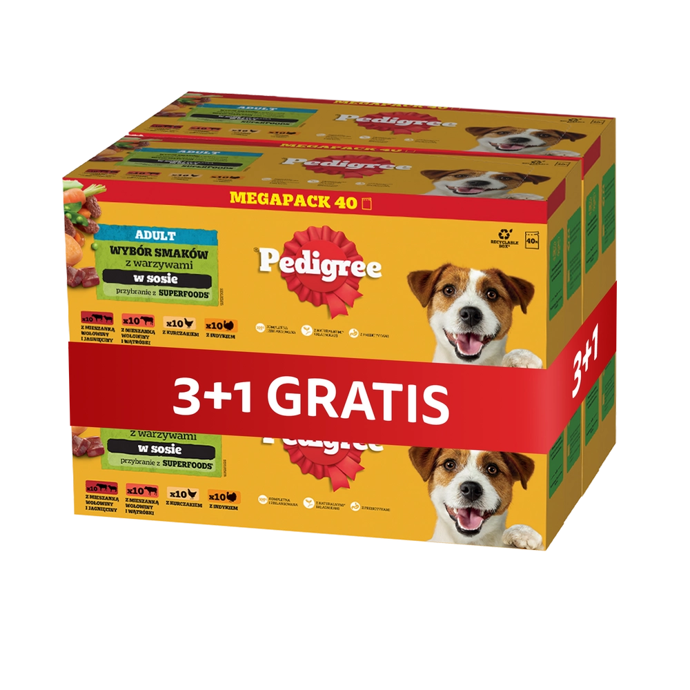 Mokra karma PEDIGREE® Adult Wybór Smaków z warzywami w aksamitnym sosie to pełnoporcjowe pożywienie przeznaczone dla dorosłych psów. Nasze receptury na sosy zawierają superfoods, takie jak: jabłko, źródło witaminy C i błonnika oraz słodkie ziemniaki, źródło potasu. Twój pies rozsmakuje się w czterech wyśmienitych smakach: z mieszanką wołowiny i jagnięciny, z mieszanką wołowiny i wątróbki, z kurczakiem, z indykiem. Receptura została opracowana przez lekarzy weterynarii i specjalistów ds. dietetyki z Instytutu Nauki o Zwierzętach WALTHAM™. Zawiera w składzie witaminę E i przeciwutleniacze, które posiadają właściwości antyoksydacyjne i wspomaga naturalne mechanizmy obronne Twojego psa oraz cynk, który wspiera zdrową skórę i sierść, aby pomóc Twojemu psu wyglądać i czuć się świetnie. Karma PEDIGREE® zawiera naturalne włókno pokarmowe i prebiotyki, które pomagają utrzymać zdrowe jelita bo każdy pies zasługuje na zdrowy brzuszek.